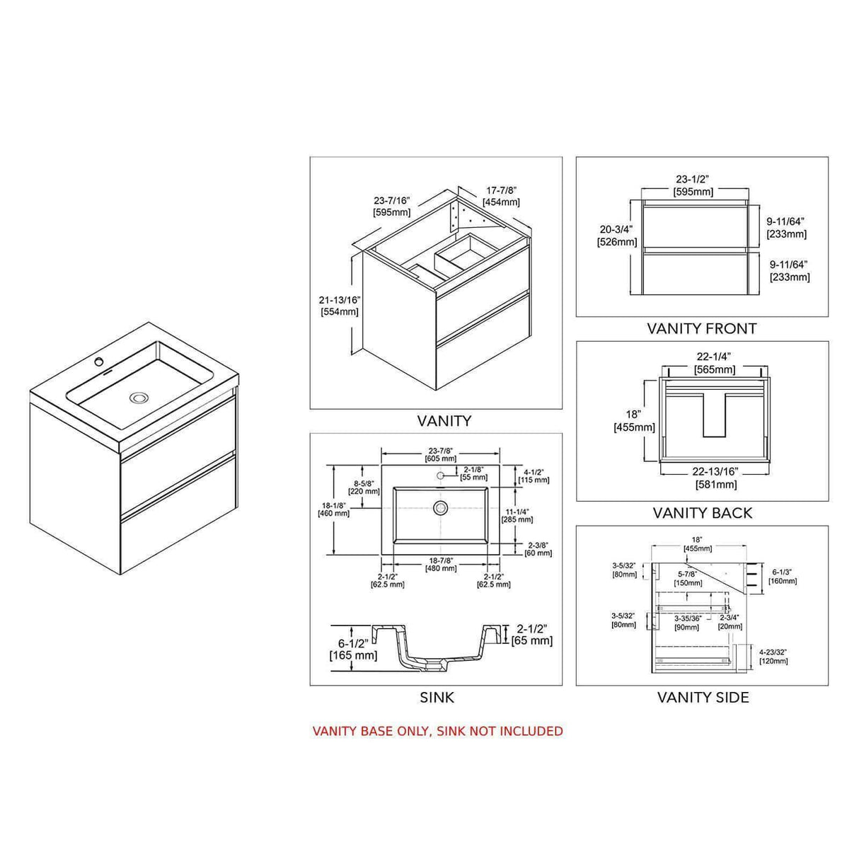 - INCLUDED: Single Vanity Base. Optional: Acrylic Sink. NOT INCLUDED: Mirror, Faucets, Pop Up, P trap, etc.