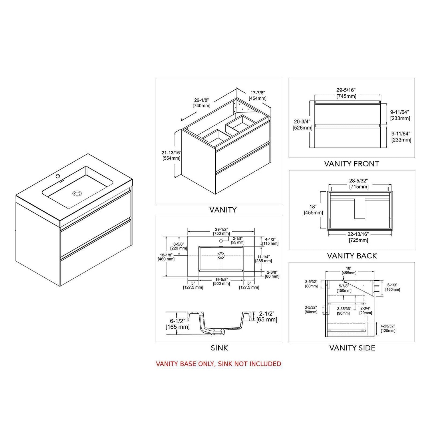 - INCLUDED: Single Vanity Base. Optional: Acrylic Sink. NOT INCLUDED: Mirror, Faucets, Pop Up, P trap, etc.
