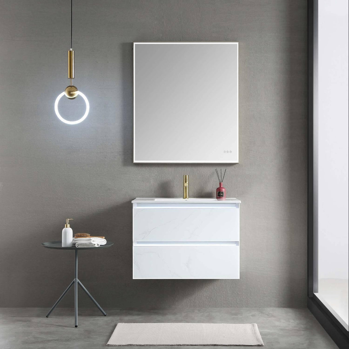 - EASY WIRE TO WALL PLUG and soft-touch switch on both sides for LED lights. TWO FULL EXTENSION DRAWERS offers you spacious storage space and keeping all daily items well organized. High-quality easy cleanup and maintenance-free CERAMIC SINK. EASY CLEAN & Maintenance free glass drawer surfaces.