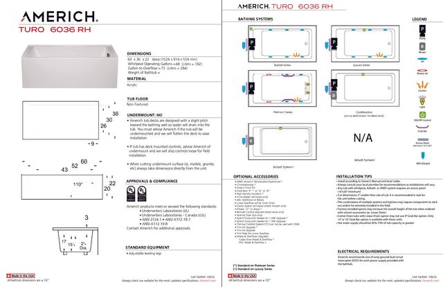 Americh TO6036TRA5-WH Turo 6036 Right Hand - Tub Only / Airbath 5 - White