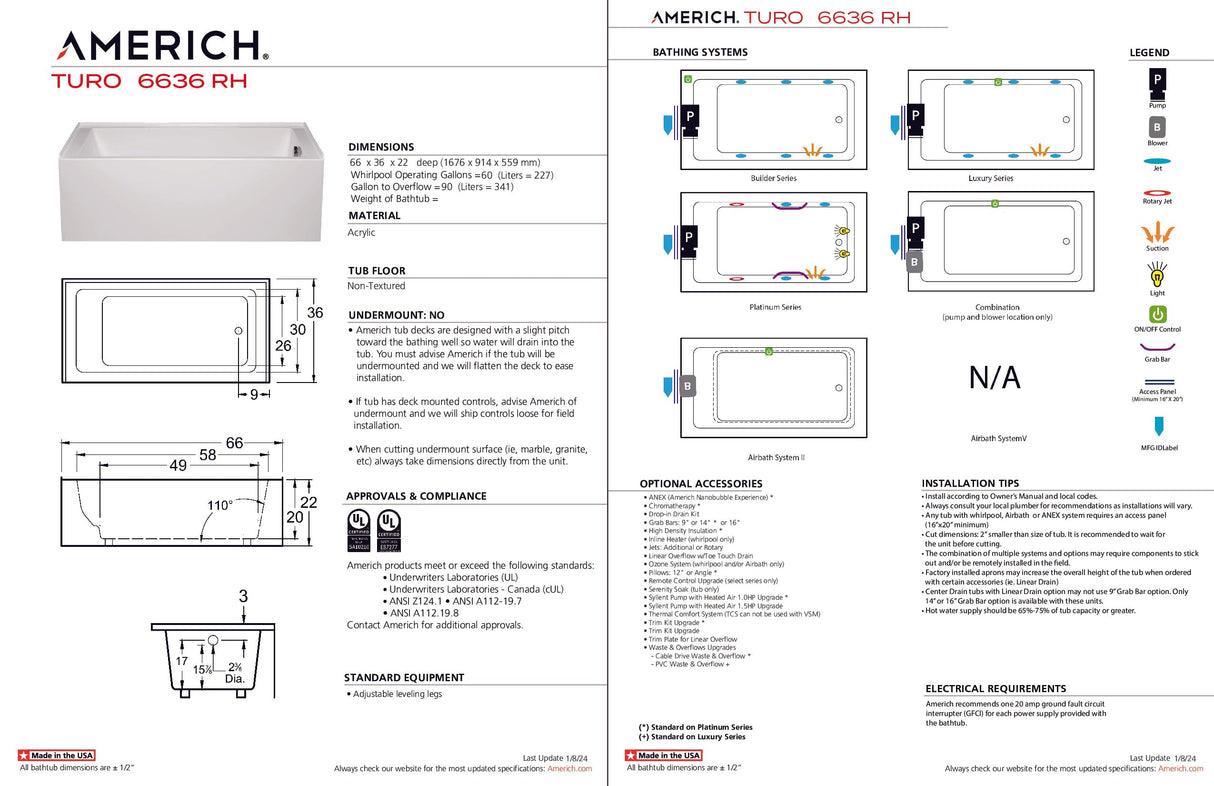 Americh TO6636TRA5-WH Turo 6636 Right Hand - Tub Only / Airbath 5 - White
