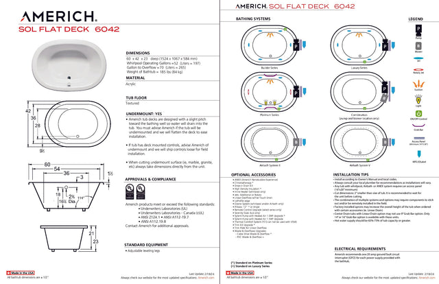 Americh SF6042TA5-BI Sol Flat Deck 6042 - Tub Only / Airbath 5 - Biscuit
