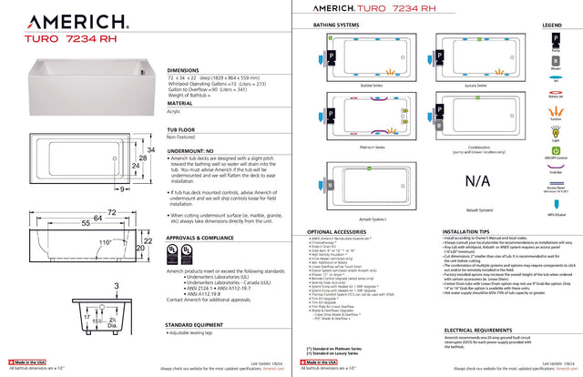 Americh TO7234TRA5-WH Turo 7234 Right Hand - Tub Only / Airbath 5 - White