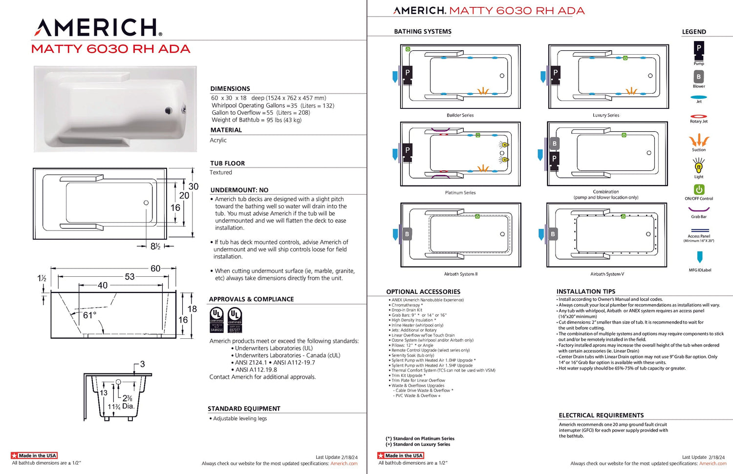 Americh MT6030ADATRA5BI Matty 6030 ADA Right Hand - Tub Only / Airbath 5 - Biscuit