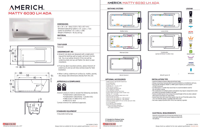 Americh MT6030ADATLA5BI Matty 6030 ADA Left Hand - Tub Only / Airbath 5 - Biscuit