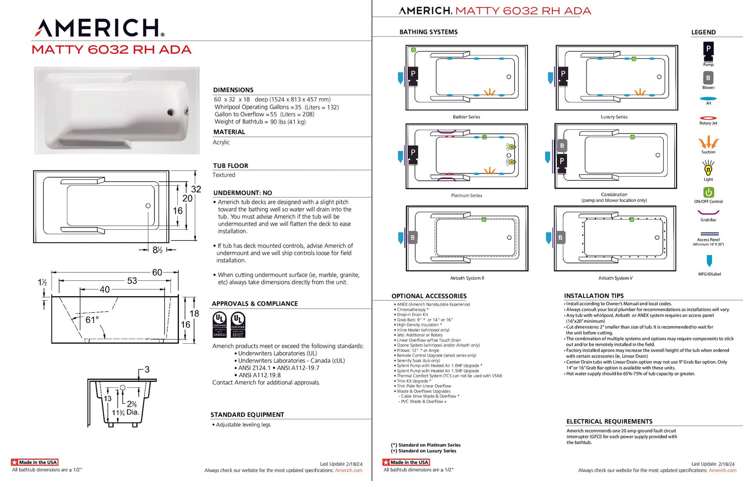 Americh MT6032ADATRA5BI Matty 6032 ADA Right Hand - Tub Only / Airbath 5 - Biscuit
