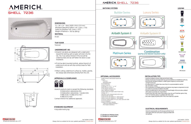 Americh SH7236TA2-WH Shell 7236 - Tub Only / Airbath 2 - White