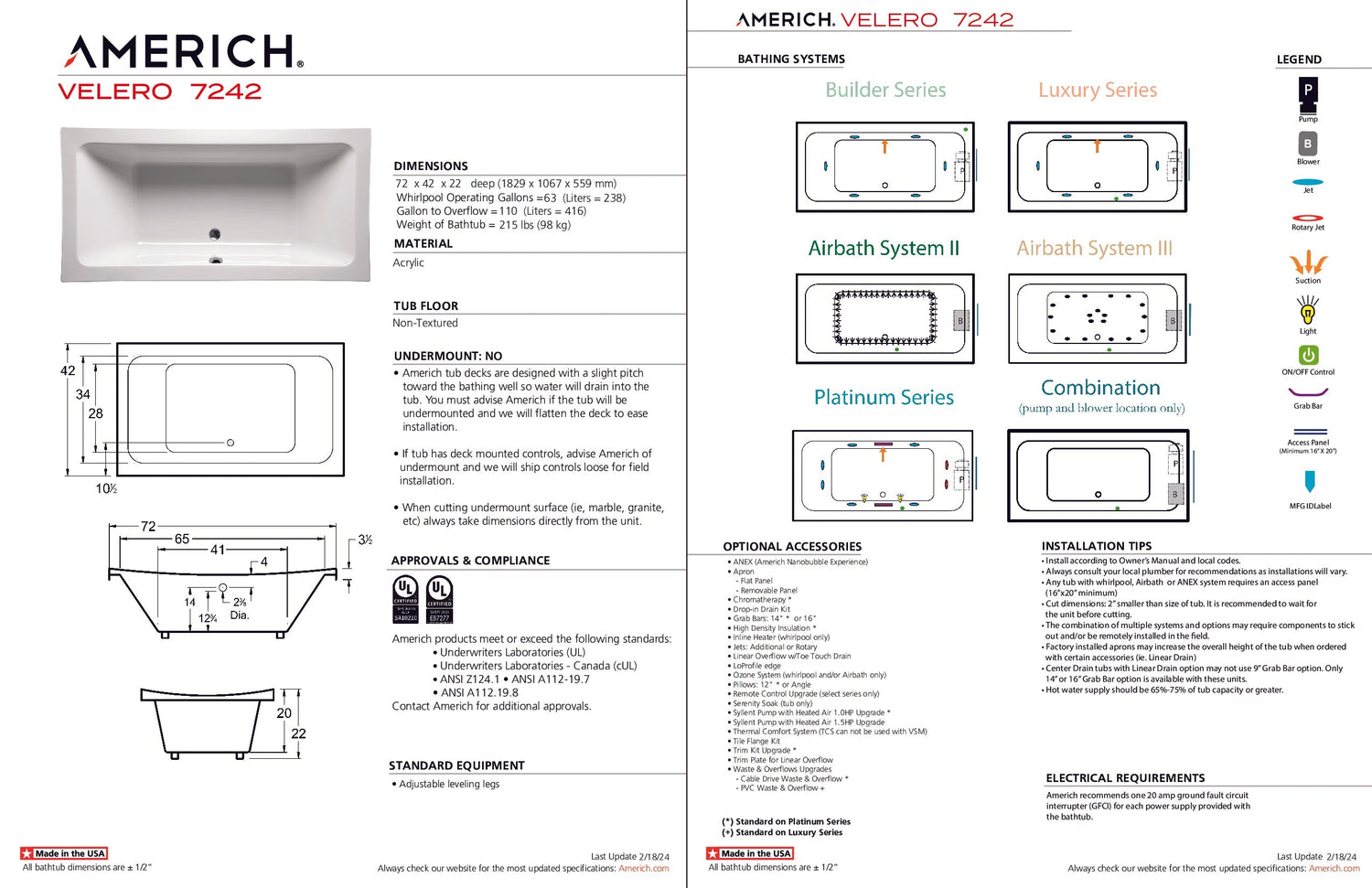 Americh VL7242TA2-WH Velero 7242 - Tub Only / Airbath 2 - White