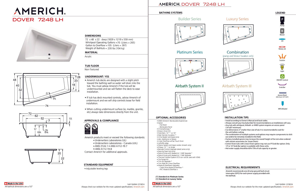 Americh DV7248TLA2-WH Dover 7248 Left Hand - Tub Only / Airbath 2 - White