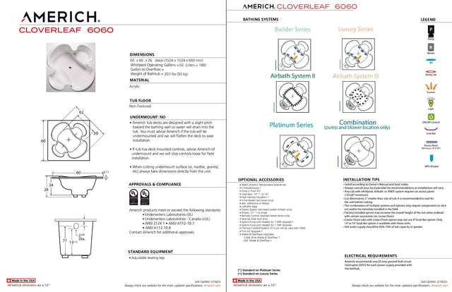 Americh CL6060TA2-WH Cloverleaf 6060 - Tub Only / Airbath 2 - White