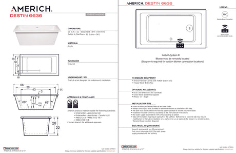 Regular price $5,92500UnavailableAmerich DN6636TA2-BI Destin 6636 - Tub Only / Airbath 2 - Biscuit
