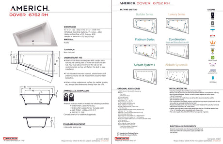 Regular price $4,87500UnavailableAmerich DV6752TRA2-WH Dover 6752 Right Hand - Tub Only / Airbath 2 - White