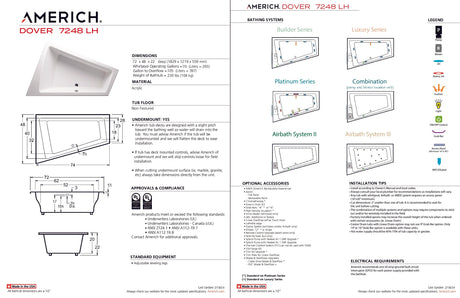 Regular price $5,06250UnavailableAmerich DV7248TLA2-WH Dover 7248 Left Hand - Tub Only / Airbath 2 - White