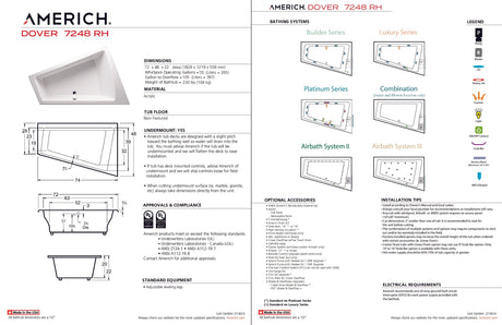 Regular price $5,06250UnavailableAmerich DV7248TRA2-WH Dover 7248 Right Hand - Tub Only / Airbath 2 - White