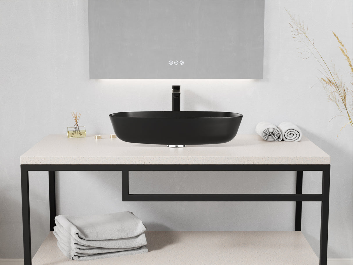 Crisp clean lines work together with soft gentle curves and a pleasing Matte Black finish to create an artistic vibe thats both energetic and easy-going. The Ariadne mounts to the top of your vanity (instead of into it) to create a look thats chic and unique, while freeing up space in the cabinet below and on the countertop. Weve included a chrome pop-up drain so its ready to install.