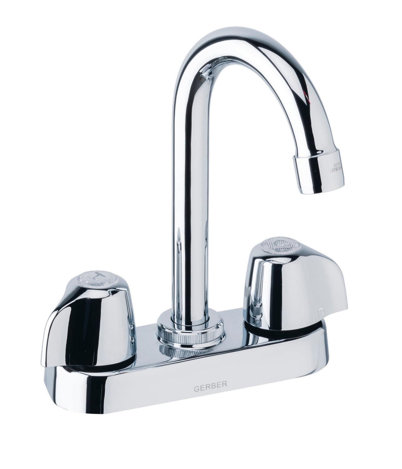 49-251 Gerber Classics Two Handle 3 Hole Intallation 4" Centers Bar Faucet Center Set/2 Handle. Gooseneck spout.Working parts can be easily replaced.Compression stems with renewable brass seats Chrome Gerber Classics Two Handle Bar Faucet 1.75GPM
