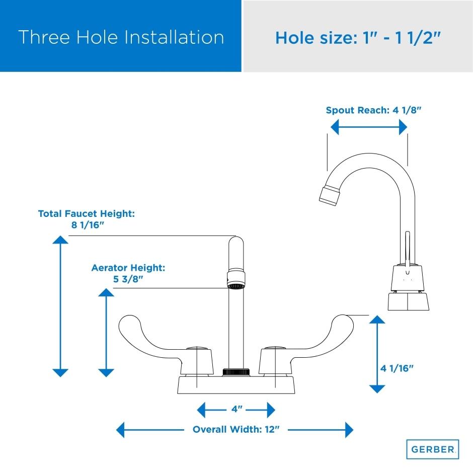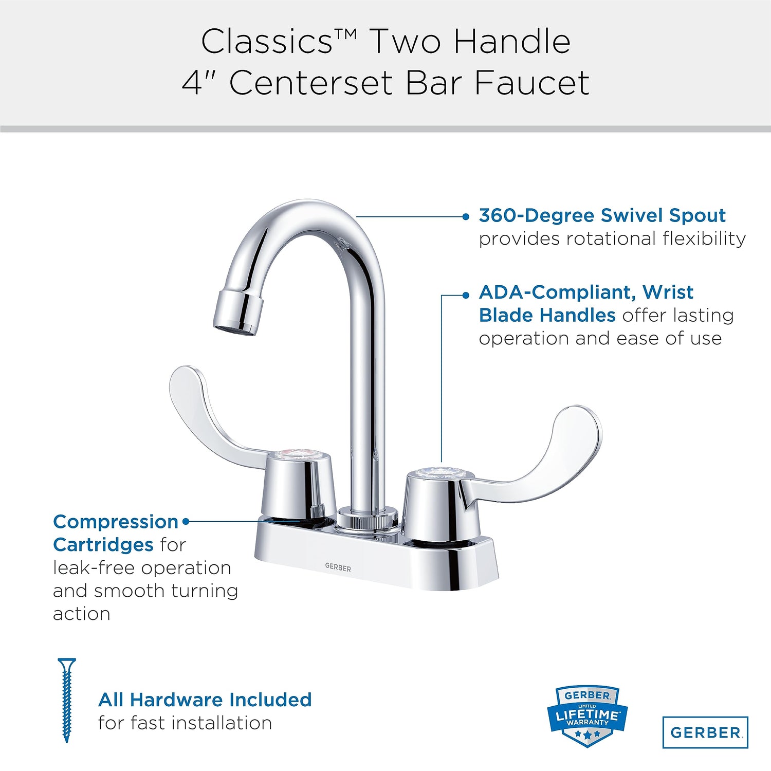 Heavy Chrome Plate Finish. Cast Brass Underbody. Aerator Has 3.0 GPM Max. Spouts and Stems Have Double O-Ring Seals. Renewable Brass Seats. 4" Wrist Blade Handles. Product Information Product Overview Flow Rate: 1.75gpmInstallation: 3-Hole InstallationBrand: Gerber Features Ceramic Disc CartridgeCompression CartridgeLead Free Waterway per Nsf/ansi 372Swivel SpoutWith Hot and Cold IndicatorWith Integrated Deck Plate Description Gerber offers a complete line of classic faucets for residential multi-family and light commercial use. Gerber Classics deliver practical and consistent performance at a compelling value. With their sturdy construction Gerber Classics install quickly and securely to get the job done right.