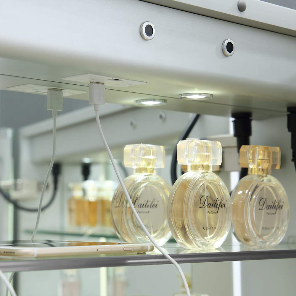 The Fresca Bathroom Medicine Cabinet comes with everything you need to create an elegant and modern bathroom, with every convenience right in front of you. On the outside, its a sophisticated mirrored medicine cabinet with a built-in dimmable surface LED task light which creates an illuminated frame within the mirror. It also has a defogger feature. Inside, theres an LED light and a handy electrical/USB outlet combo for an electric shaver, toothbrush or other essentials. The interior features four adjustable glass shelves and a mirrored back wall. The double-sided mirrored door swings right 170 degrees on soft-close BLUM hinges. Measuring 48"W x 30"H x 5"D, this medicine cabinet is available in several sizes.