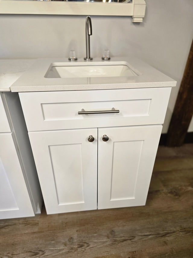 24" Cab-Tec White Shaker Vanity Set with Custom Quartz Top and Facetted Brushed Nickel Faucet