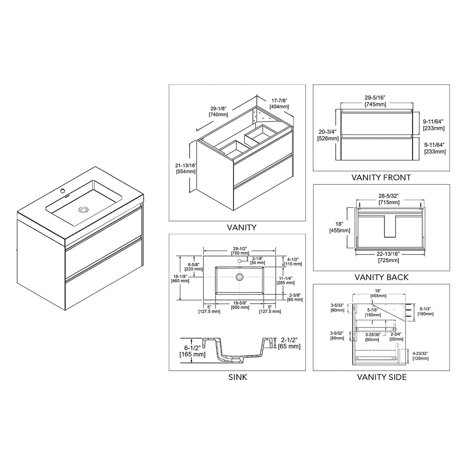 Blossom Berlin 30" 2-Drawer Glossy White & Glossy Grey Wall-Mounted Vanity Set With Acrylic Top And Integrated Single Sink