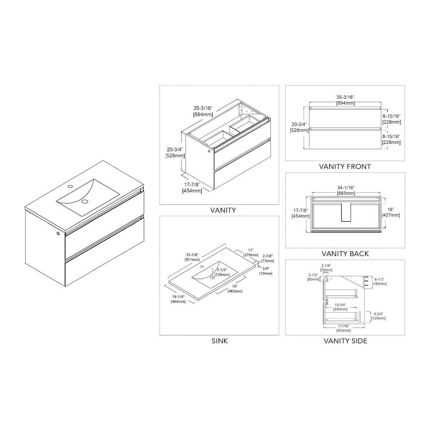 Blossom Jena 36" 2-Drawer Calacatta White Wall-Mounted Vanity Set With Ceramic Top and Integrated Single Sink