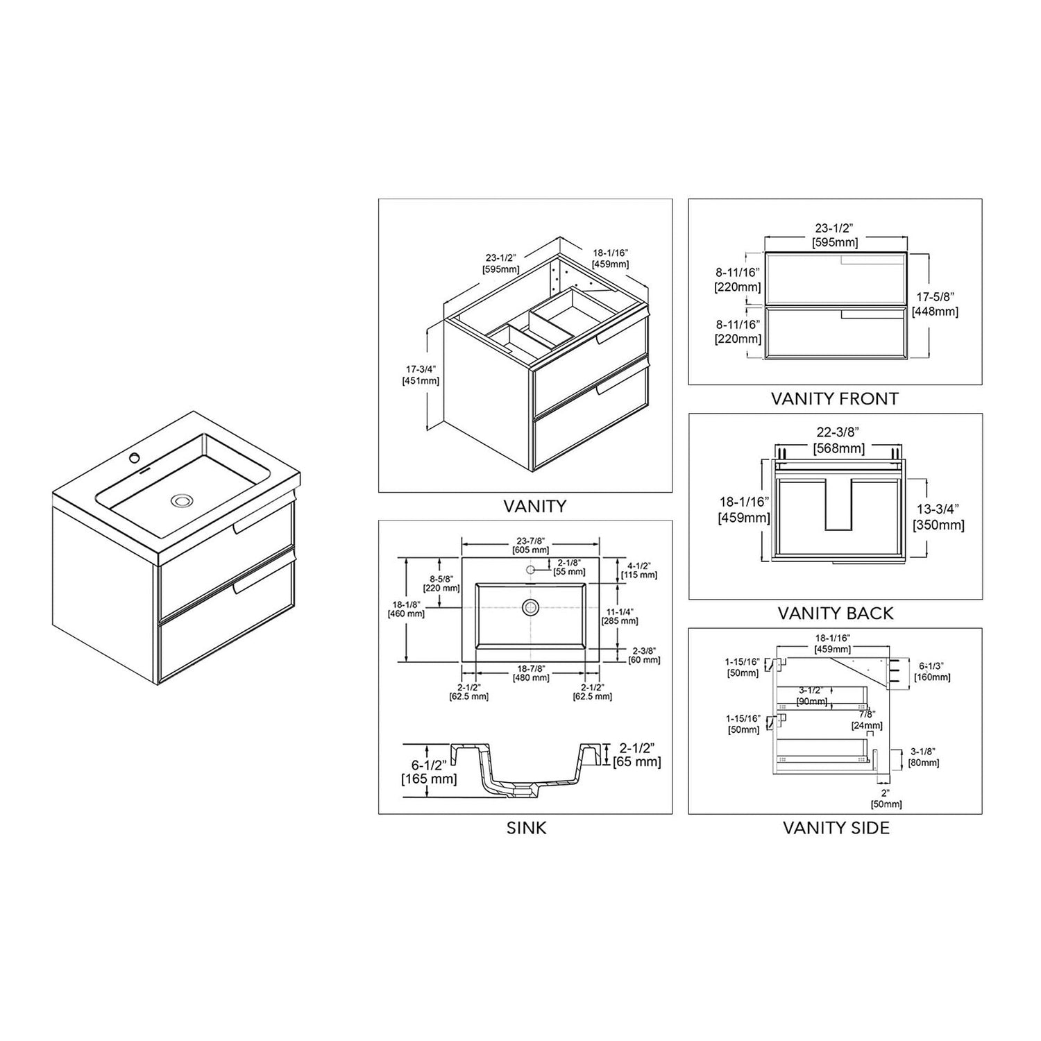 Blossom Sofia 24" 2-Drawer Matte Gray Wall-Mounted Vanity Set With Acrylic Top and Integrated Single Sink