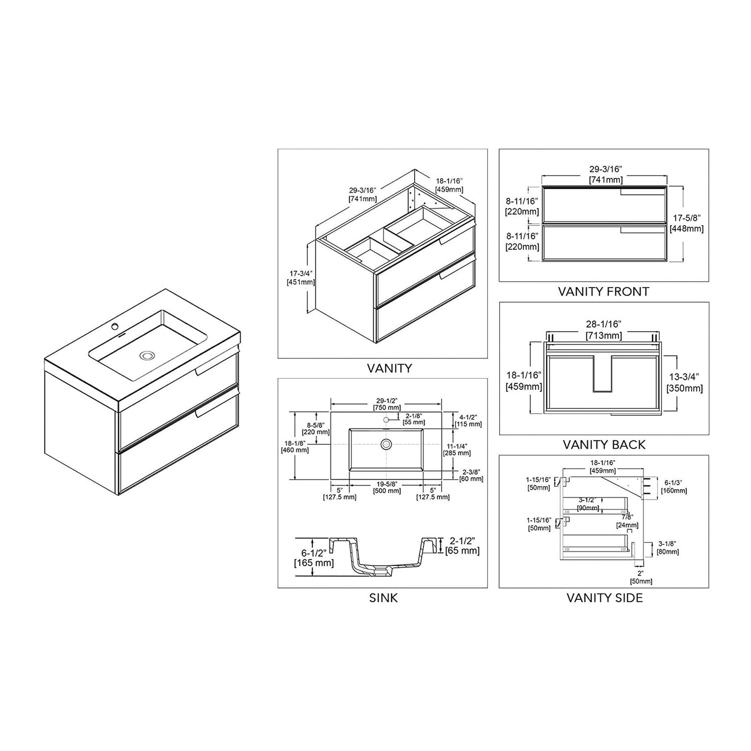 Blossom Sofia 30" 2-Drawer Matte Gray Wall-Mounted Vanity Set With Acrylic Top and Integrated Single Sink