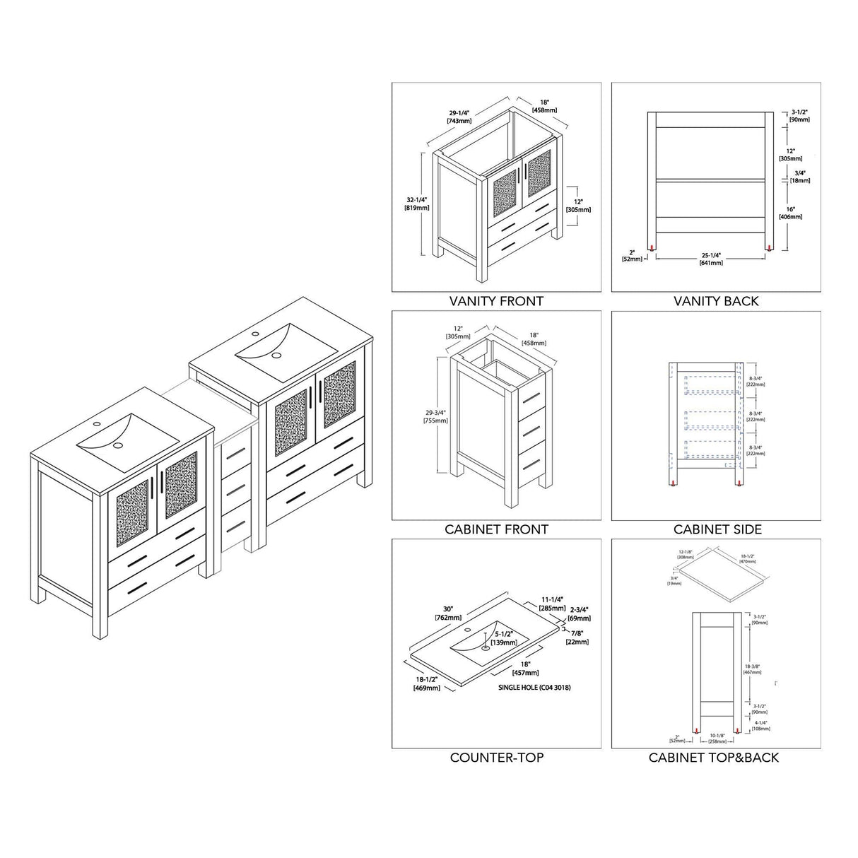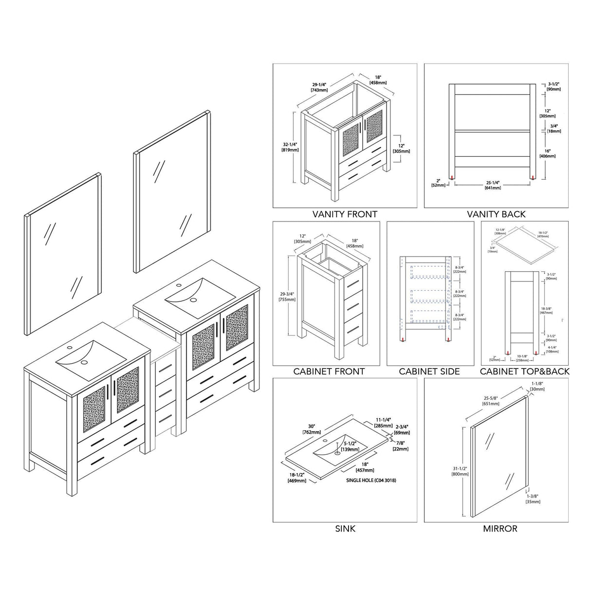 - INCLUDED: Vanity Base. Optional: Sink and Mirror. Not included: Faucets, Pop Up, P trap, etc.