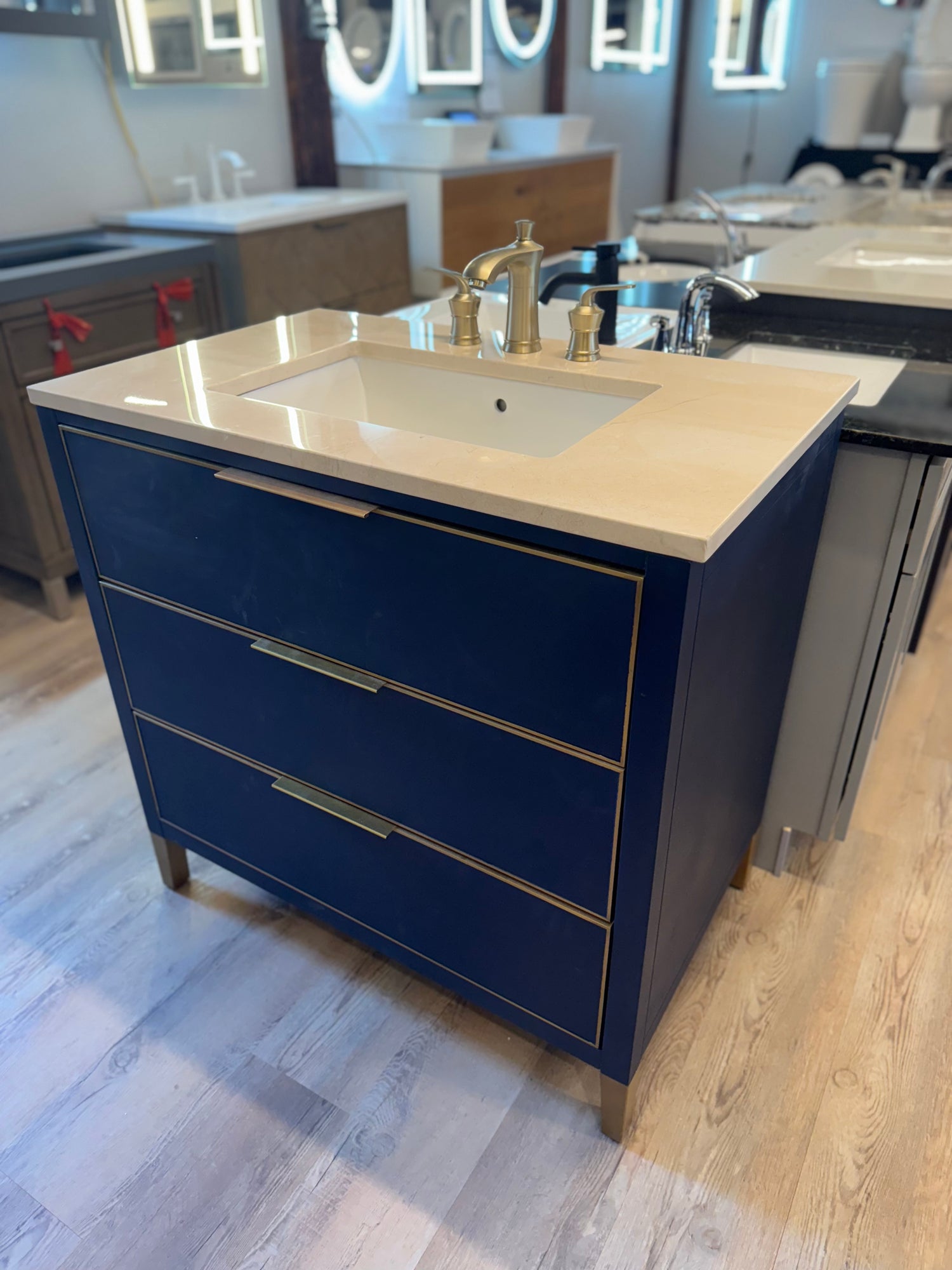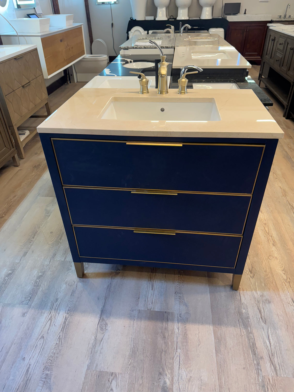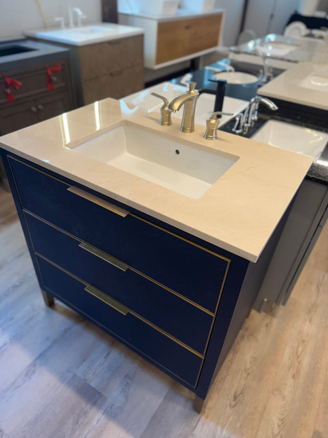 36" Navy Vanity Set with Tan Marble Vanity Top with Brass Widespread Faucet