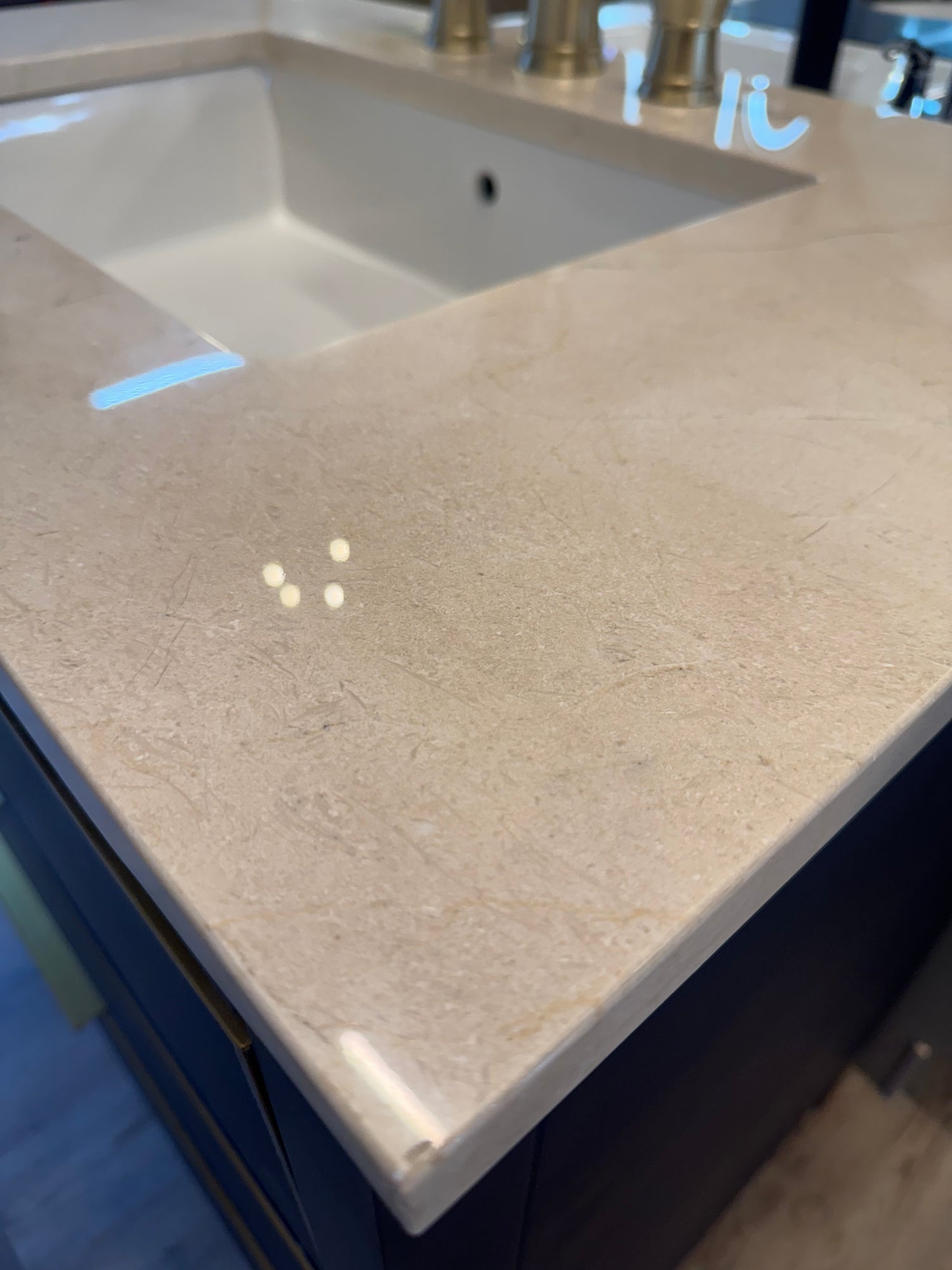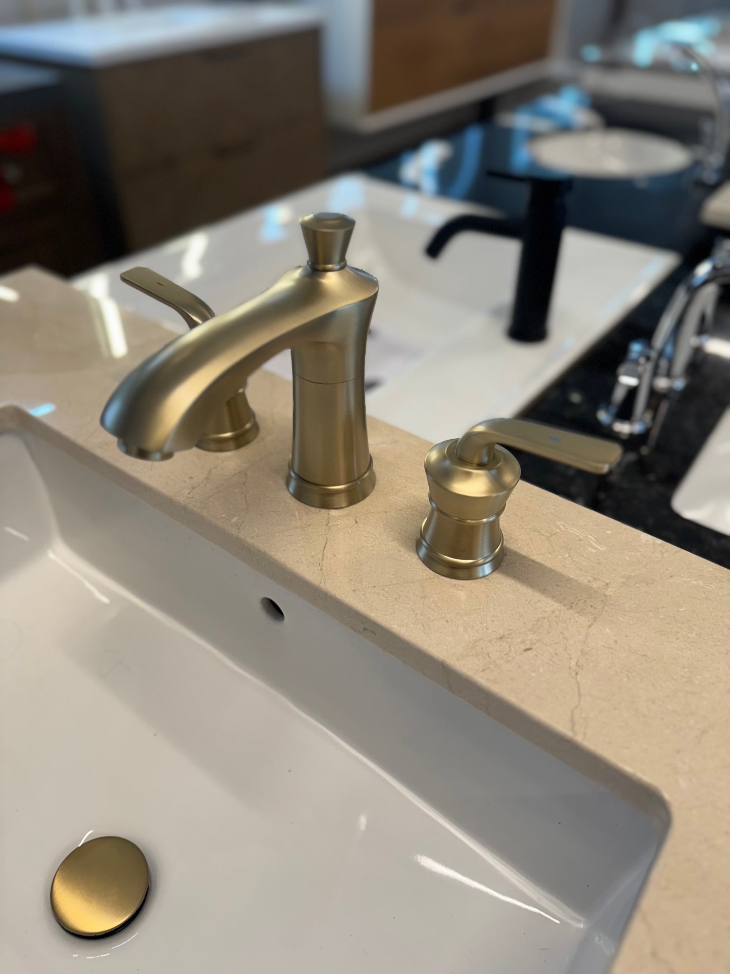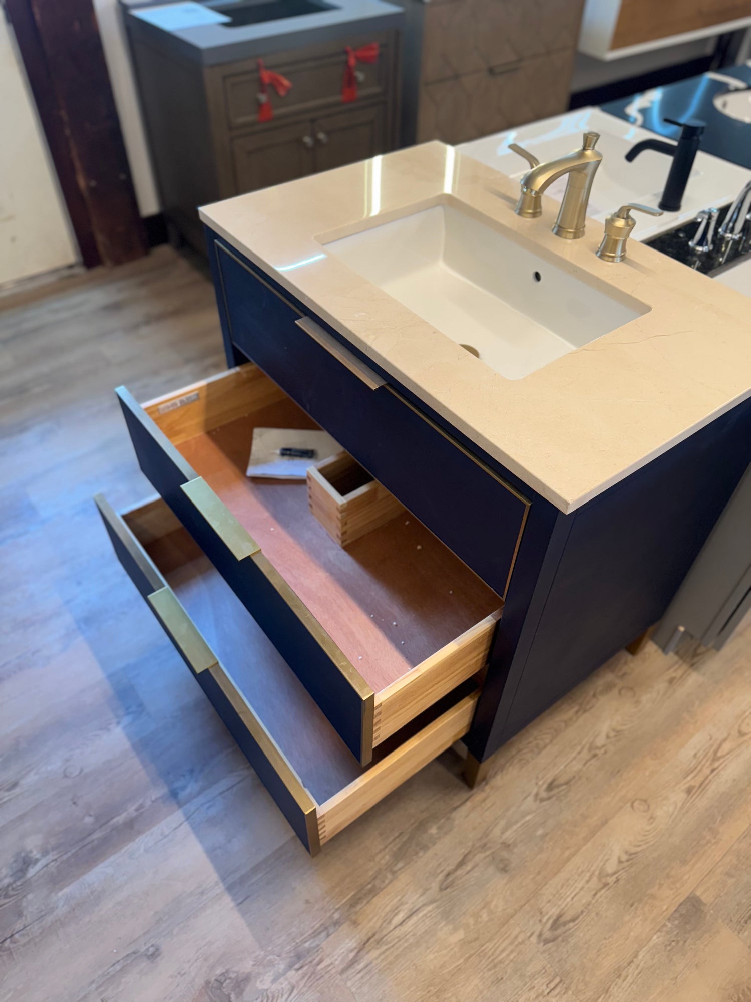 36" Navy Vanity Set with Tan Marble Vanity Top with Brass Widespread Faucet