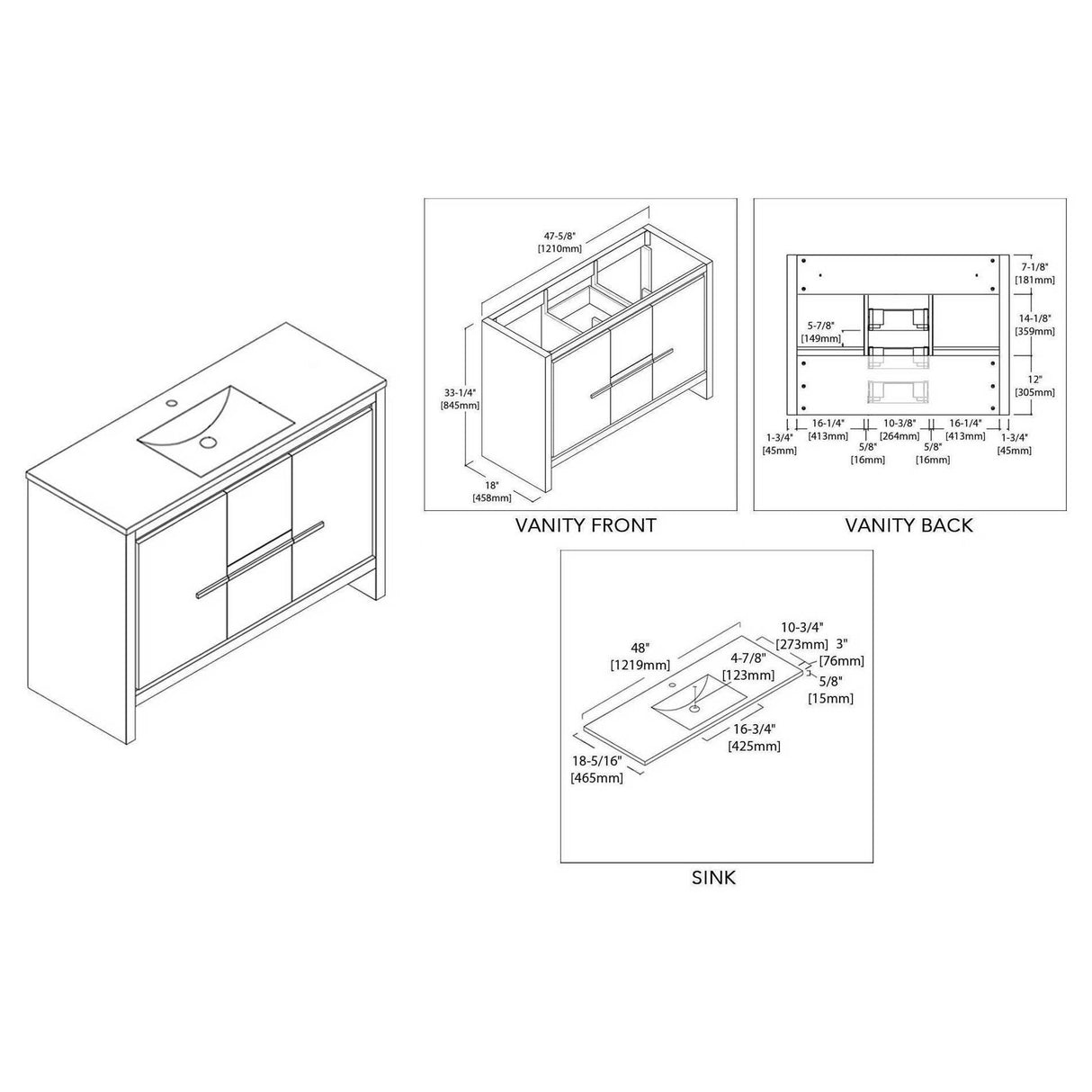 Blossom Milan 48" Single Vanity Set is built using heavy-duty grade ceramic material coated with glossy porcelain and a durable white or silver grey cabinet. It provides a smooth and elegant design also resistant to dent or distortion. Its classic drawer & modern European minimalist design offers a sleek appearance with spacious storage spaces. This mid-century Modern Bathroom Single Vanity Set thick top & side Panels with a flat door design provide extra strangeness. It is two times longer lasting and resistant to moisture and humidity.