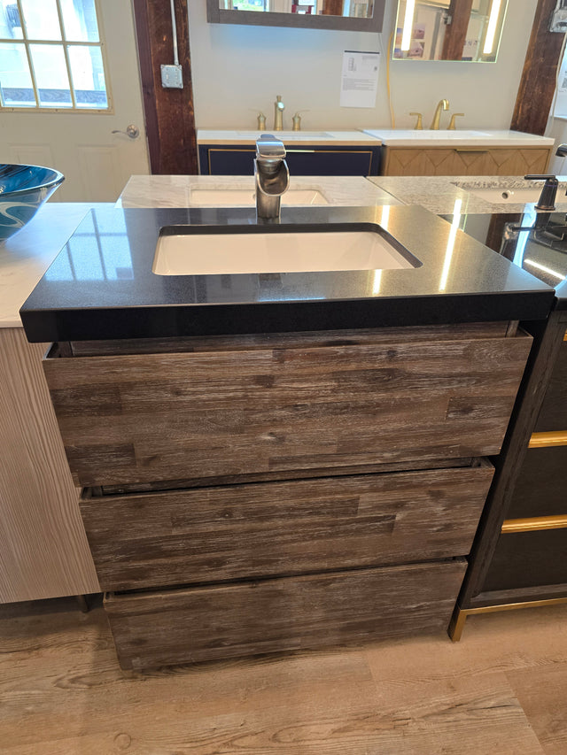30" Dark, Natural Wood Vanity Set with Black Granite Top and Brushed Nickel Waterfall Faucet