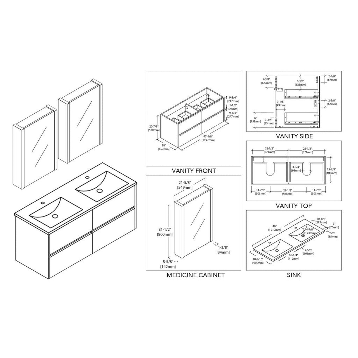 Blossom Valencia 48" Double Navy Blue Wall-Mounted Vanity Base Only