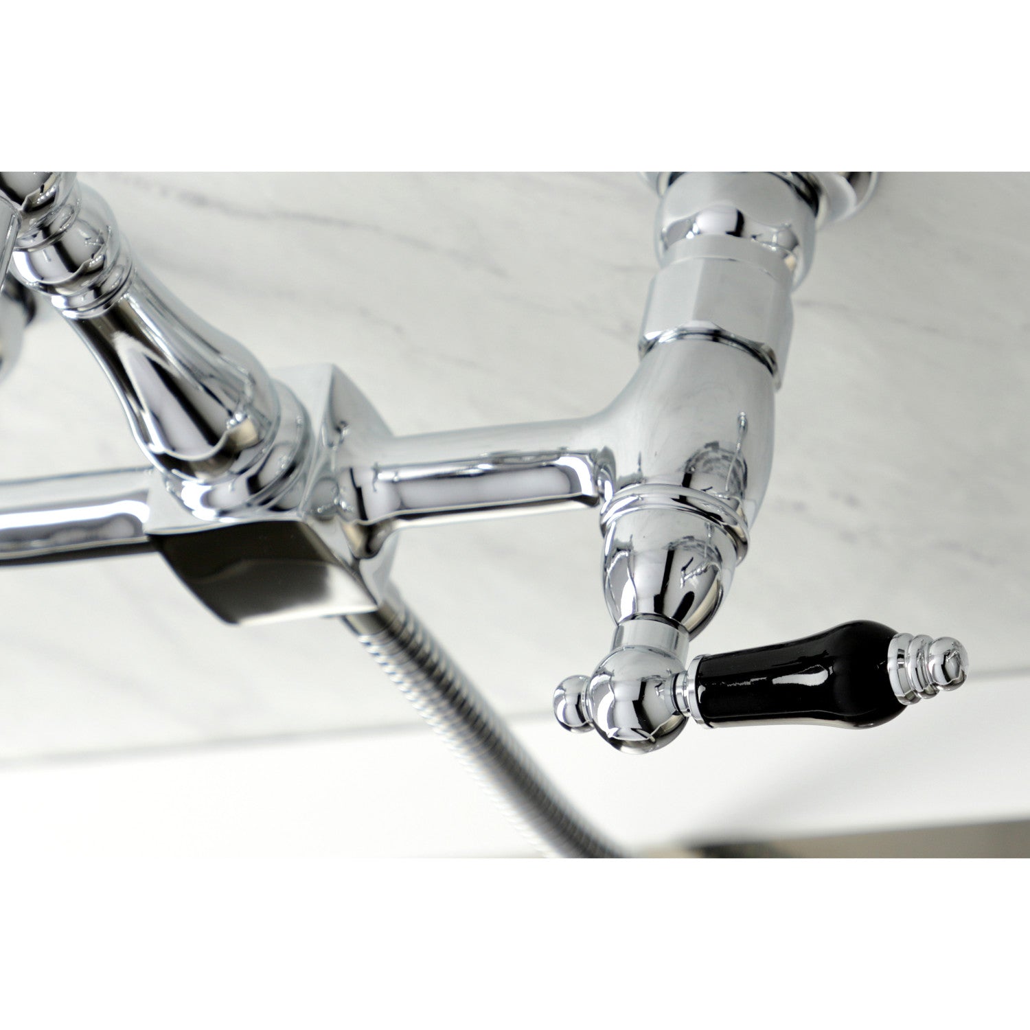 Crafted in commendations to English nobility, the exemplary design of this faucet manifests regality and elegance with its black porcelain handles. Because of the horizontal pop that it gives, it is more of a centerpiece, perfect for planning a design around. Additionally, the unique look is great for a variety of styles from Art Deco to Farmhouse. The polished chrome finish will also add a glistening elegance to your kitchen ensemble. Allow the brass construction and swivel abilities to provide a sturdy and reliant fixture as it maximizes your counter space. Glamorize your home today with the traditional elegance of this faucet.