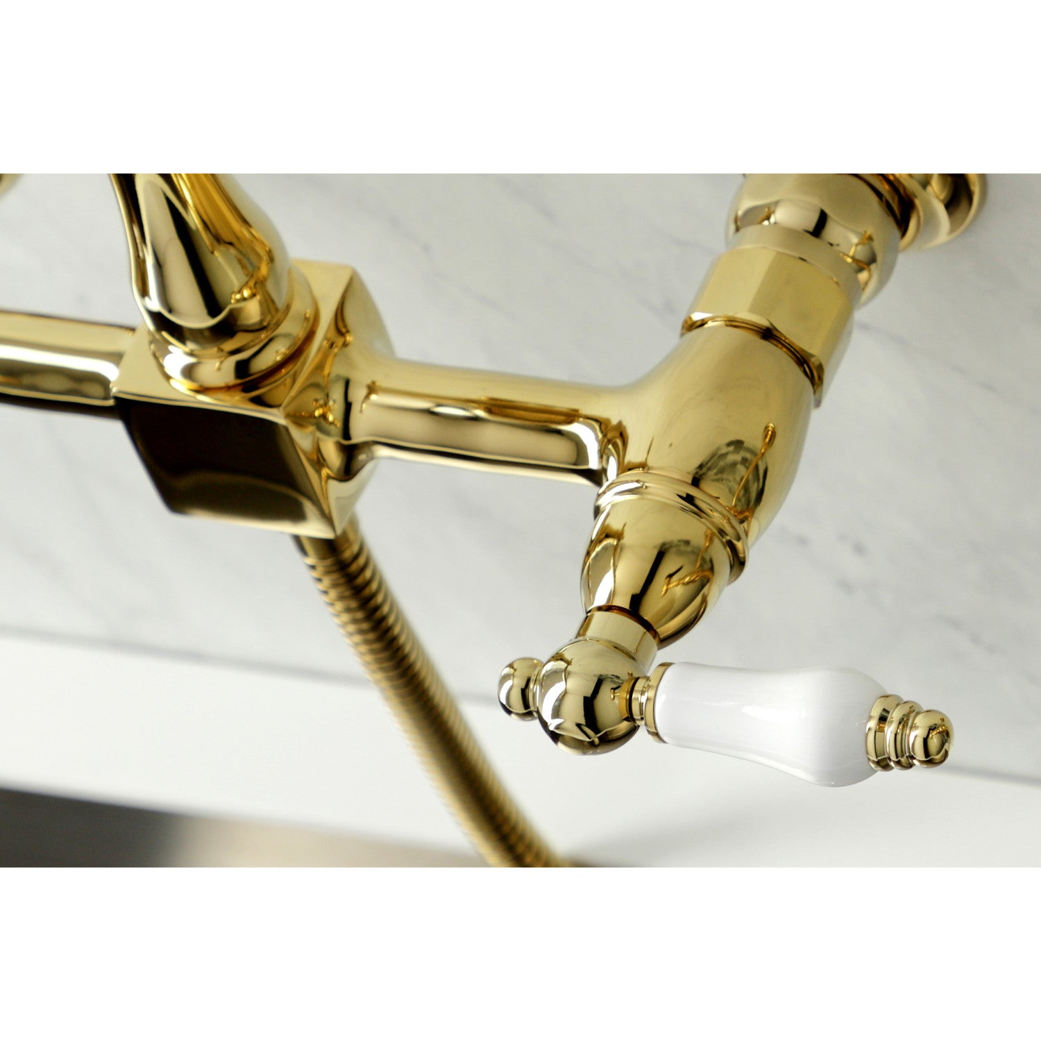 Heritage KS1262PLBS Two-Handle 2-Hole Wall Mount Bridge Kitchen Faucet with Brass Sprayer, Polished Brass