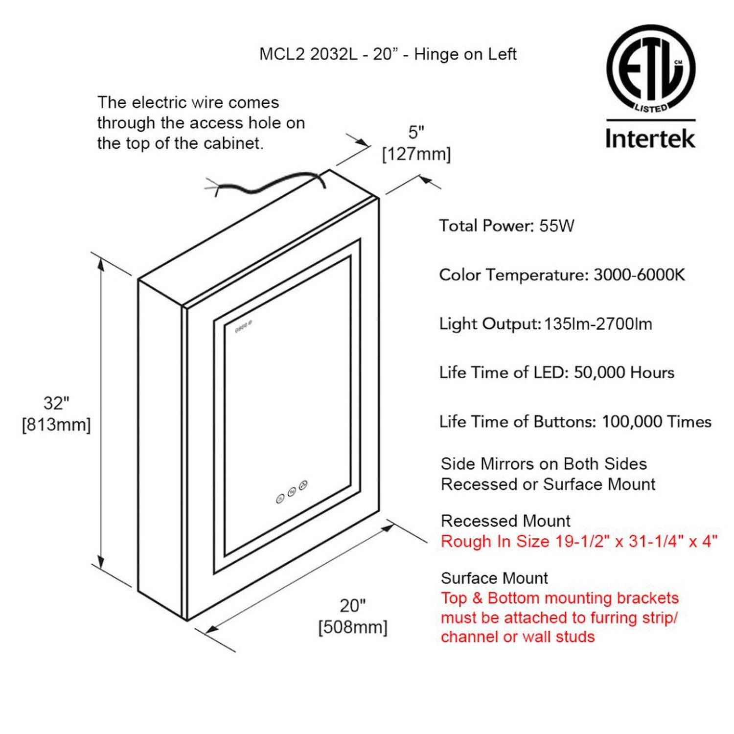 Blossom Asta 20" Recessed Or Surface Mount Left And Right-Hinged Door LED Mirror Medicine Cabinet Set Of 2 With 3 Adjustable Glass Shelves, Built-In Defogger, Dimmer, USB & Electrical Outlet