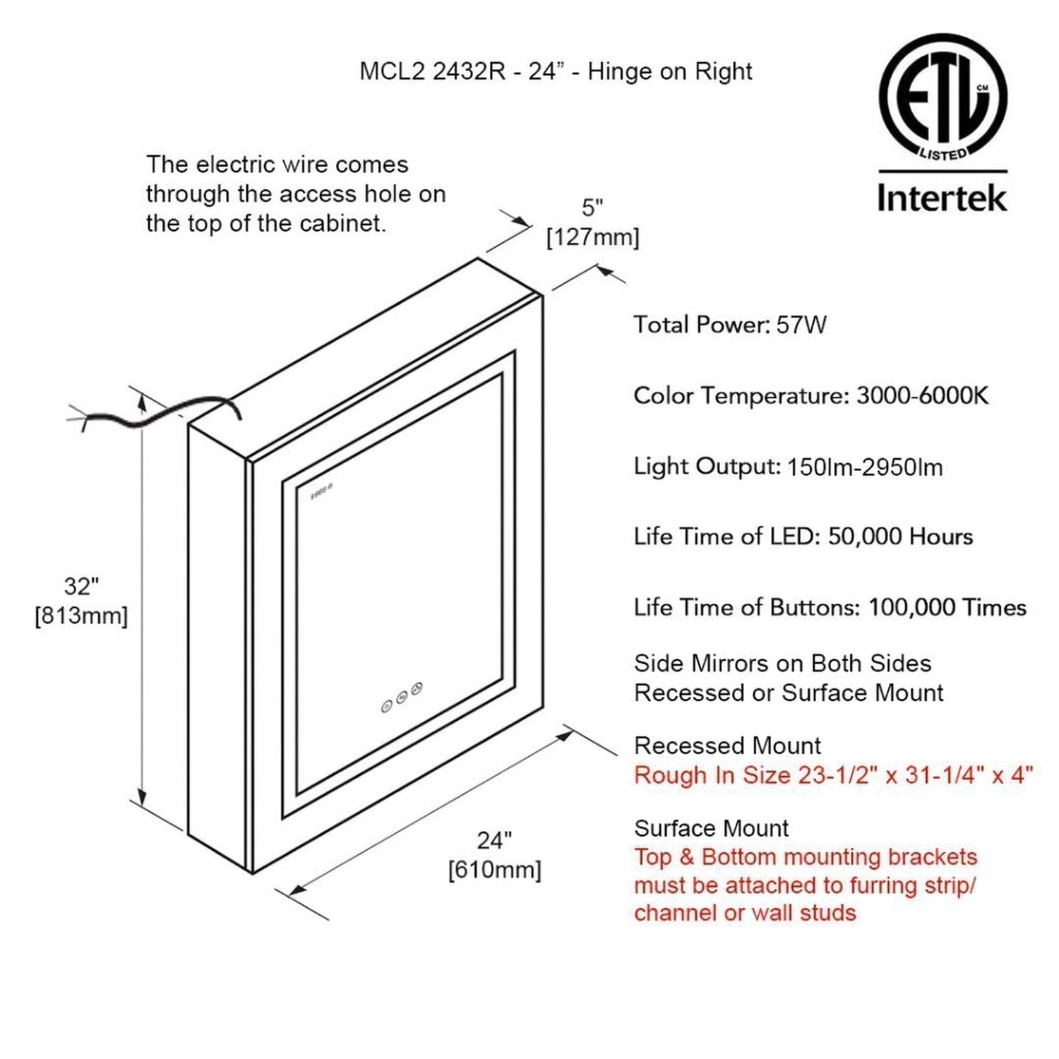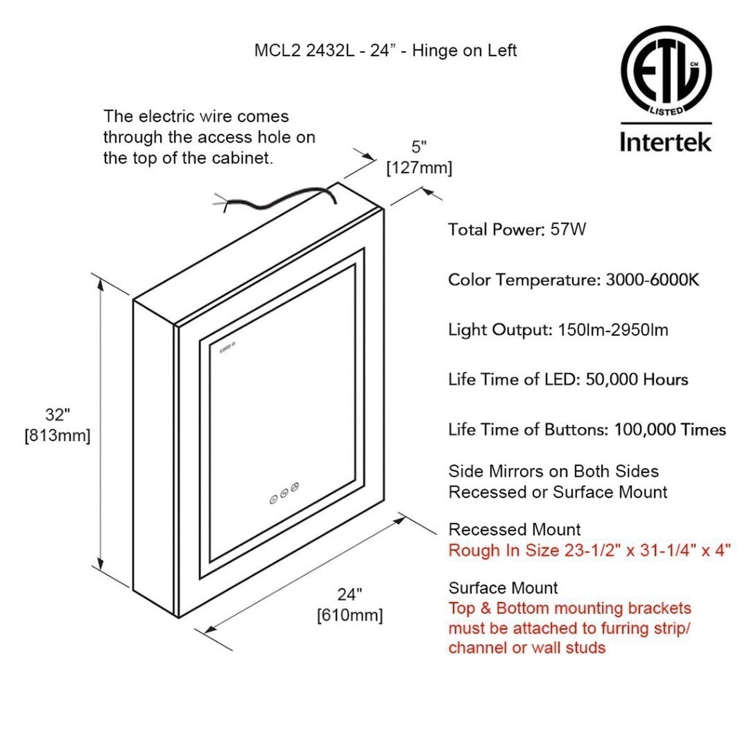 Blossom Asta 24" Recessed or Surface Mount Left and Right-Hinged Door LED Mirror Medicine Cabinet Set Of 2 With Adjustable Glass Shelves, Built-In Defogger, Dimmer, Digital Clock, Temp Display, USB & Electrical Outlet