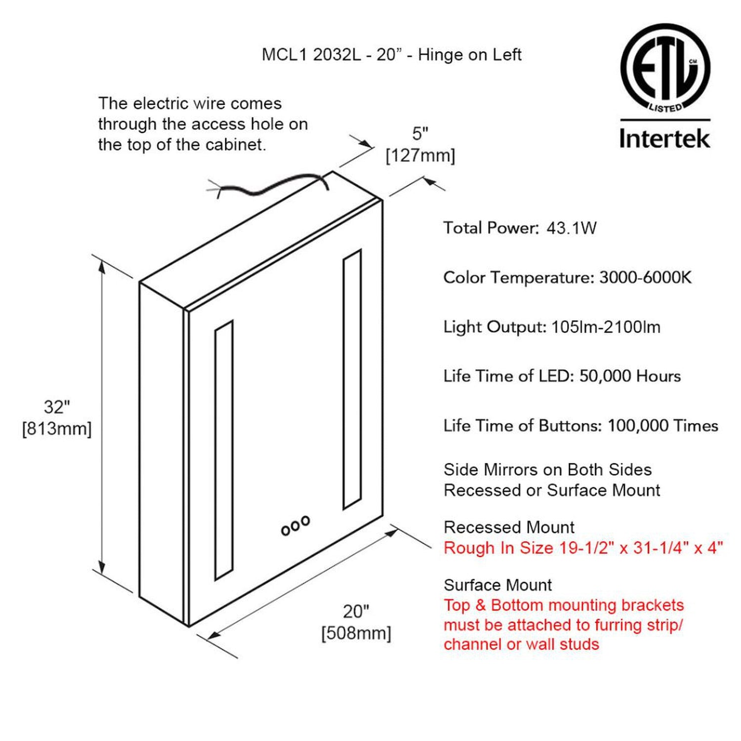 Blossom Pillar 20" Recessed Or Surface Mount Left And Right-Hinged Door Led Mirror Medicine Cabinet Set Of 2 With 3 Adjustable Glass Shelves, Built-In Defogger, Dimmer, USB & Electrical Outlet
