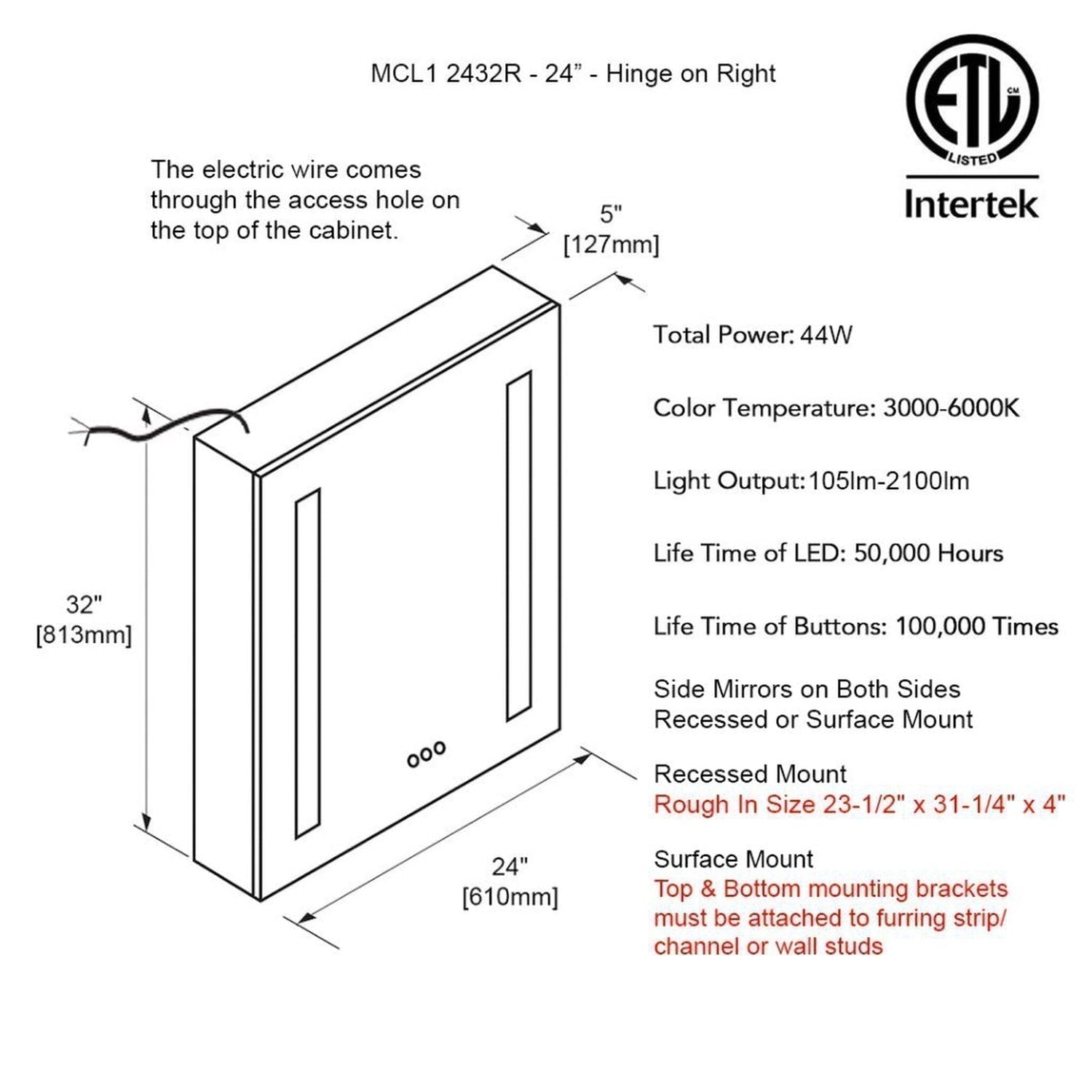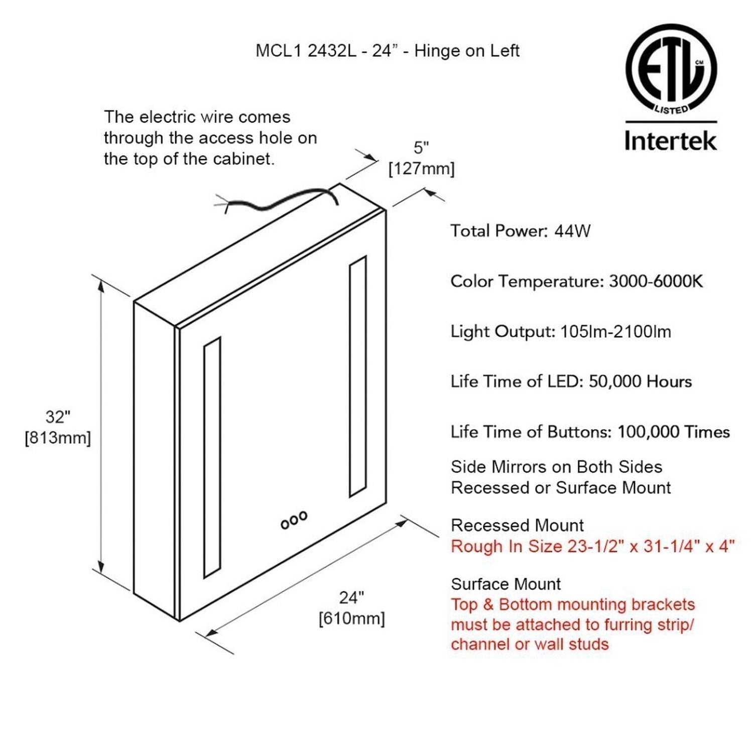 Blossom Pillar 24" Recessed or Surface Mount Left and Right-Hinged Door LED Mirror Medicine Cabinet Set Of 2 With Adjustable Glass Shelves, Built-In Defogger, Dimmer, USB & Electrical Outlet