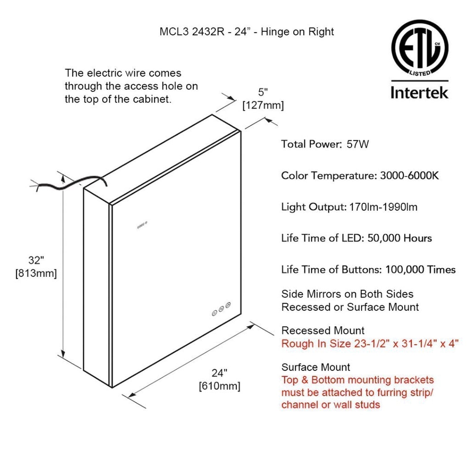 Blossom Sirius 24" Recessed or Surface Mount Left and Right-Hinged Door LED Mirror Medicine Cabinet Set Of 2 With Adjustable Glass Shelves, Built-In Defogger, Dimmer, Digital Clock, Temp Display, USB & Electrical Outlet