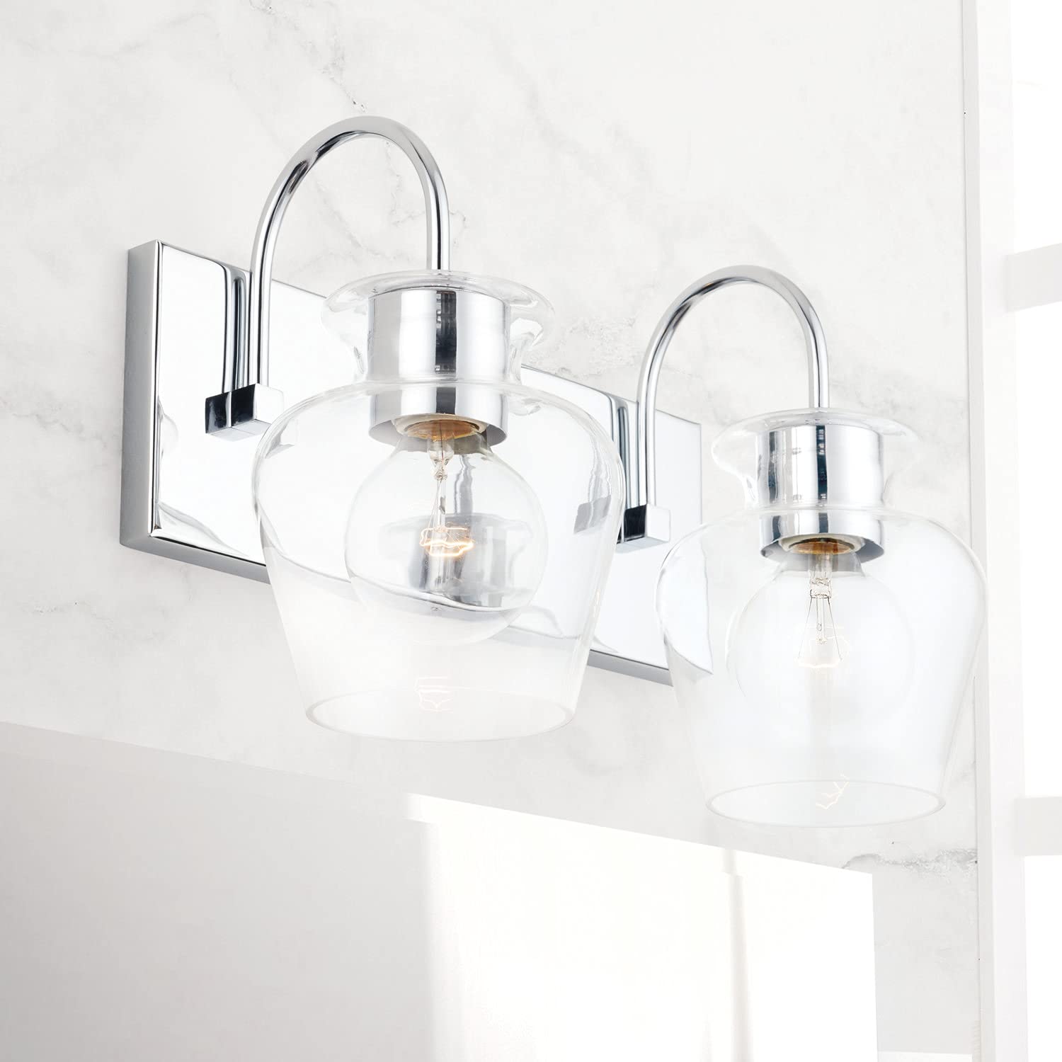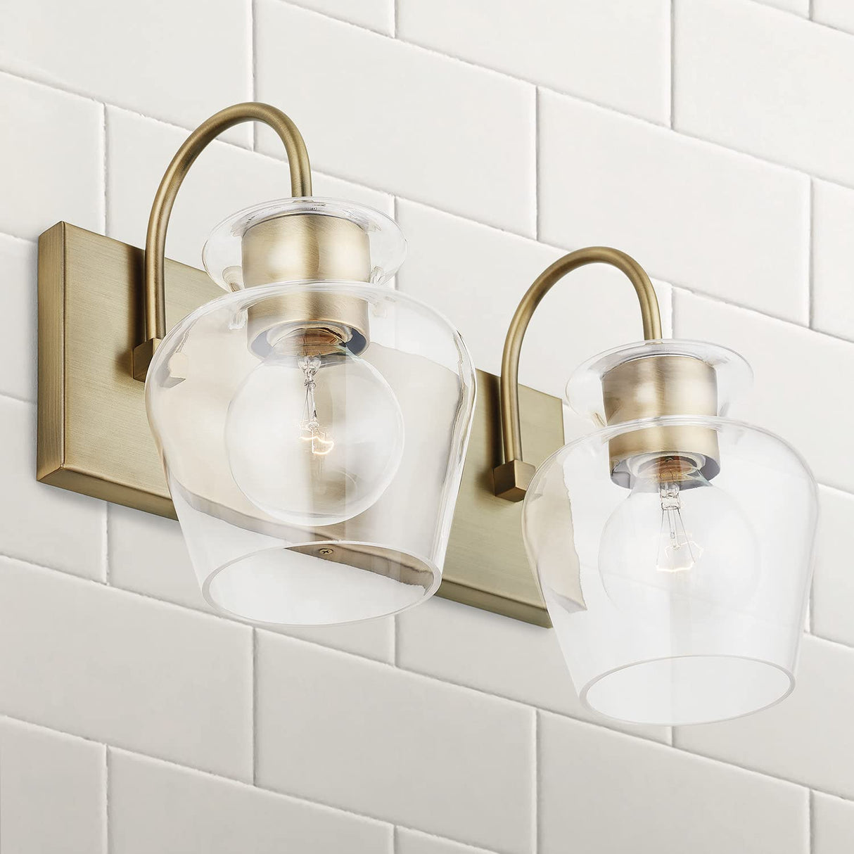 Clear glass shades hand-blown into simple silhouettes are accented by arched arms creating a modern or transitional look. Available in Aged Brass or Chrome as a 2-light or 3-light vanity.