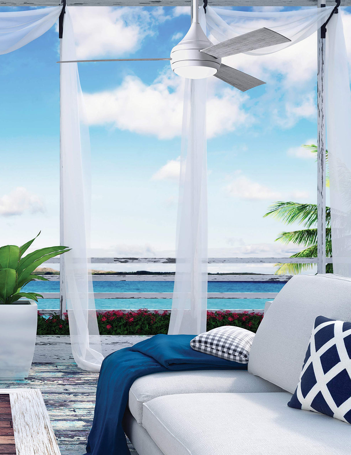 With teardrop motor housing, the 52" Donaire 316 marine grade stainless steel coastal wet location ceiling fan is transitional in design. Donaire is finished in brushed bronze, brushed stainless, matte black or gloss white, equipped with all weather blades and 16W LED dimmable light kit with optional metal cover. Constructed of entirely 316 marine grade stainless steel, the Donaire carries a limited lifetime warranty.
