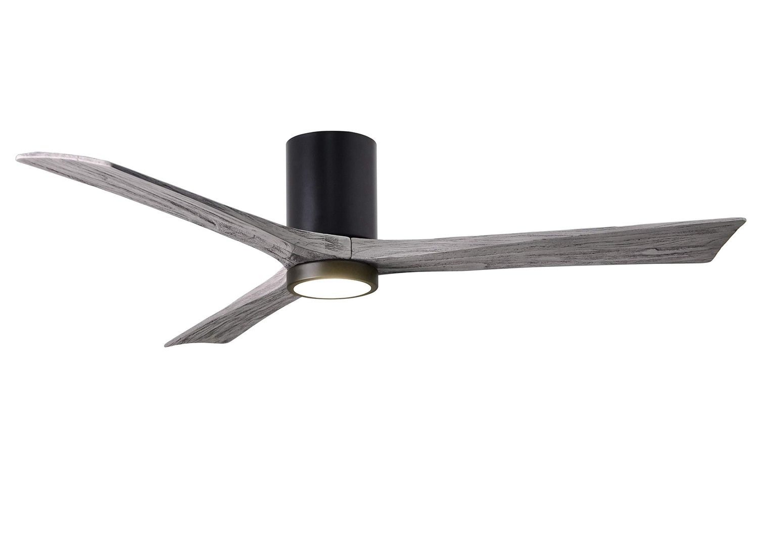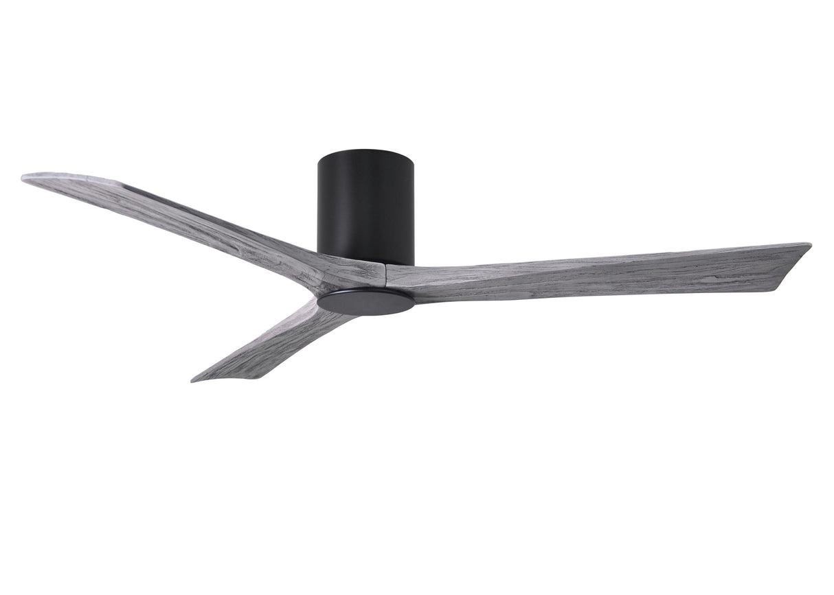 Matthews Fan IR3HLK-BK-BW-60 Irene-3HLK three-blade flush mount paddle fan in Matte Black finish with 60” solid barn wood tone blades and integrated LED light kit.