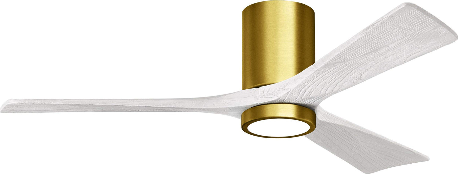Matthews Fan IR3HLK-BRBR-MWH-52 Irene-3HLK three-blade flush mount paddle fan in Brushed Brass finish with 52” solid matte white wood blades and integrated LED light kit.