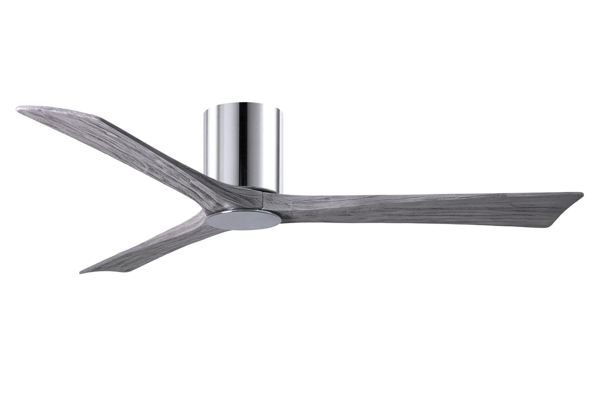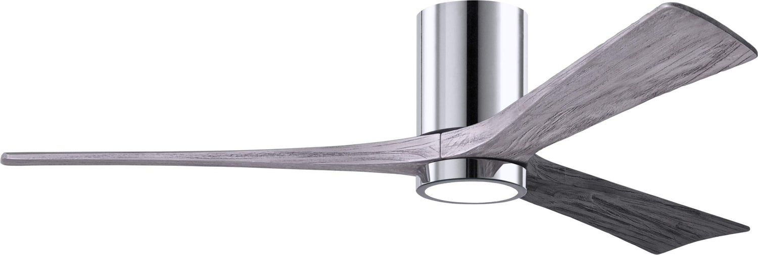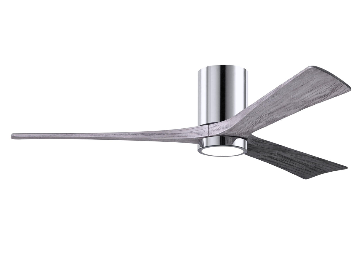 Matthews Fan IR3HLK-CR-BW-60 Irene-3HLK three-blade flush mount paddle fan in Polished Chrome finish with 60” solid barn wood tone blades and integrated LED light kit.