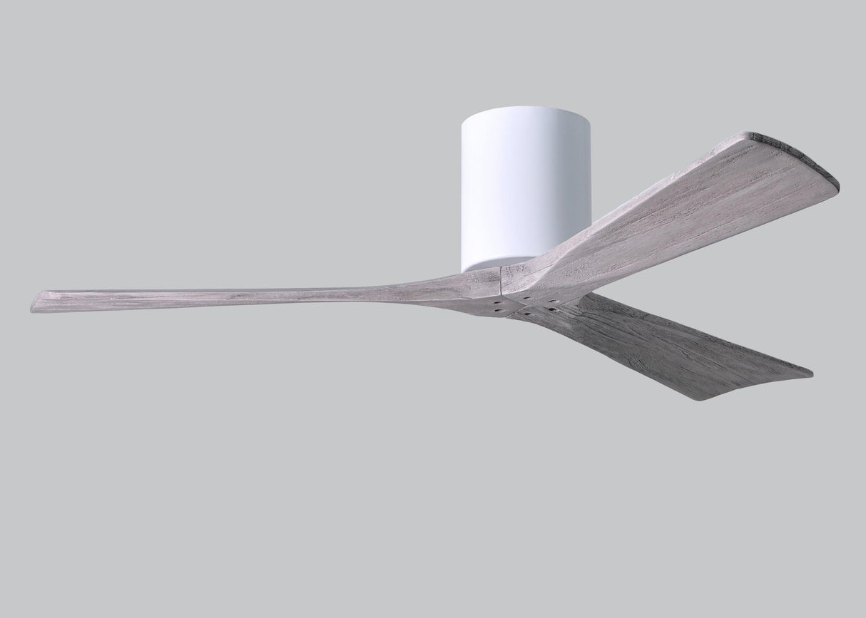 Matthews Fan IR3H-WH-BW-52 Irene-3H three-blade flush mount paddle fan in Gloss White finish with 52” solid barn wood tone blades.