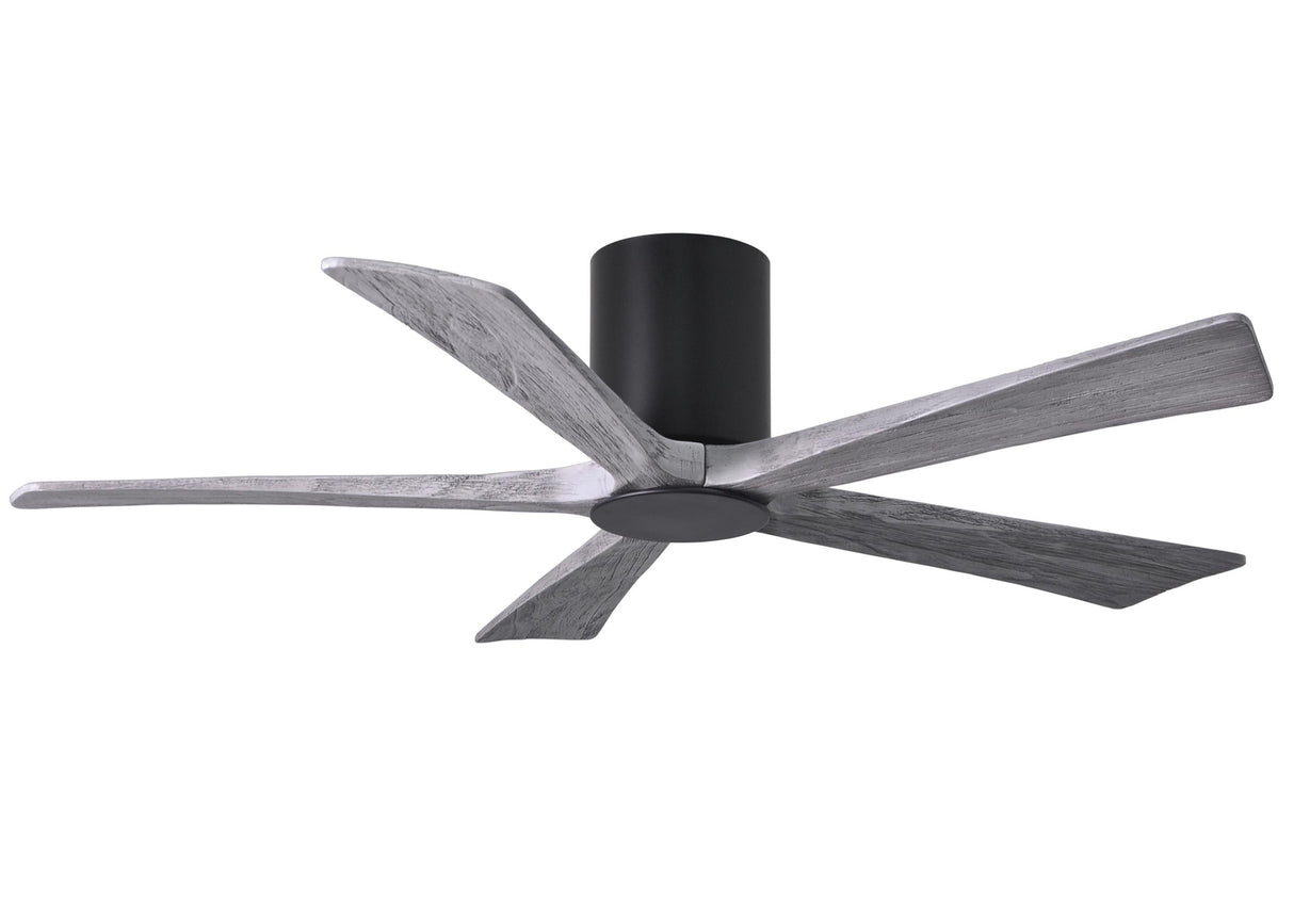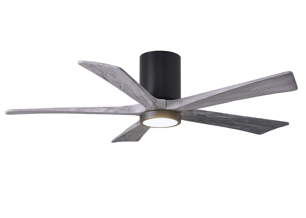 Matthews Fan IR5HLK-BK-BW-52 IR5HLK five-blade flush mount paddle fan in Matte Black finish with 52” solid barn wood tone blades and integrated LED light kit.