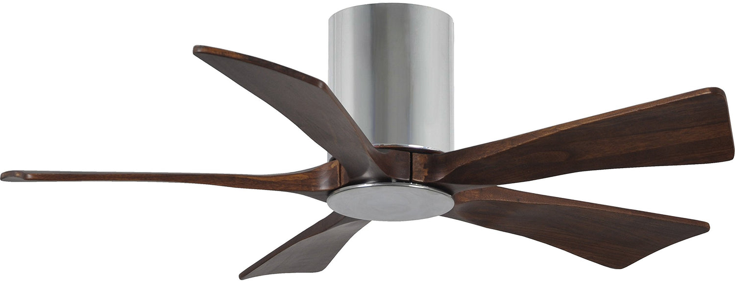 Matthews Fan IR5HLK-CR-WA-42 IR5HLK five-blade flush mount paddle fan in Polished Chrome finish with 42” solid walnut tone blades and integrated LED light kit.