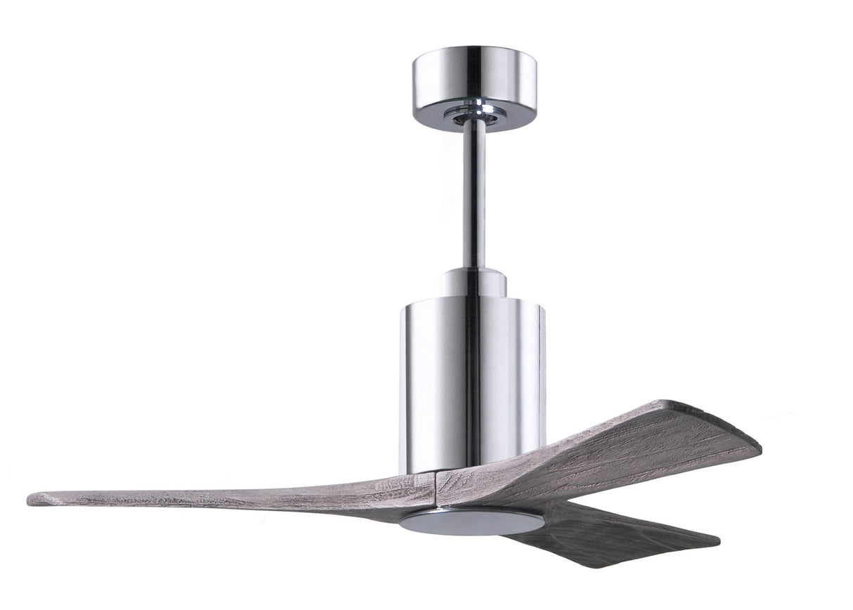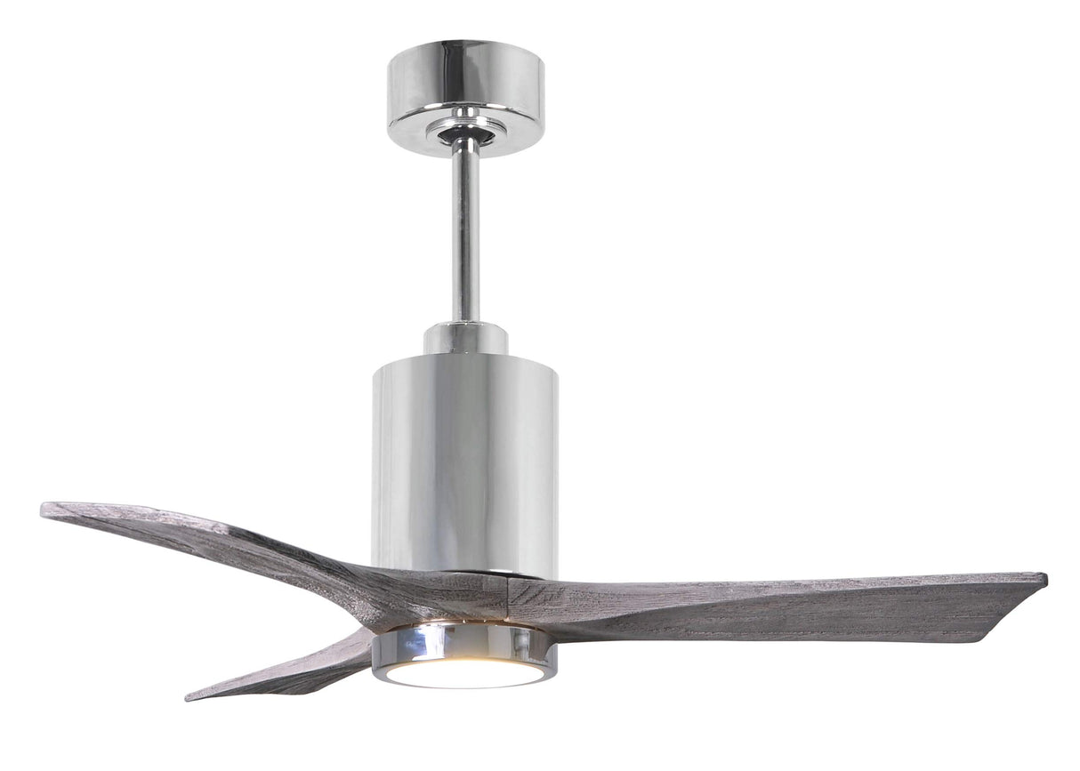 Matthews Fan PA3-CR-BW-42 Patricia-3 three-blade ceiling fan in Polished Chrome finish with 42” solid barn wood tone blades and dimmable LED light kit