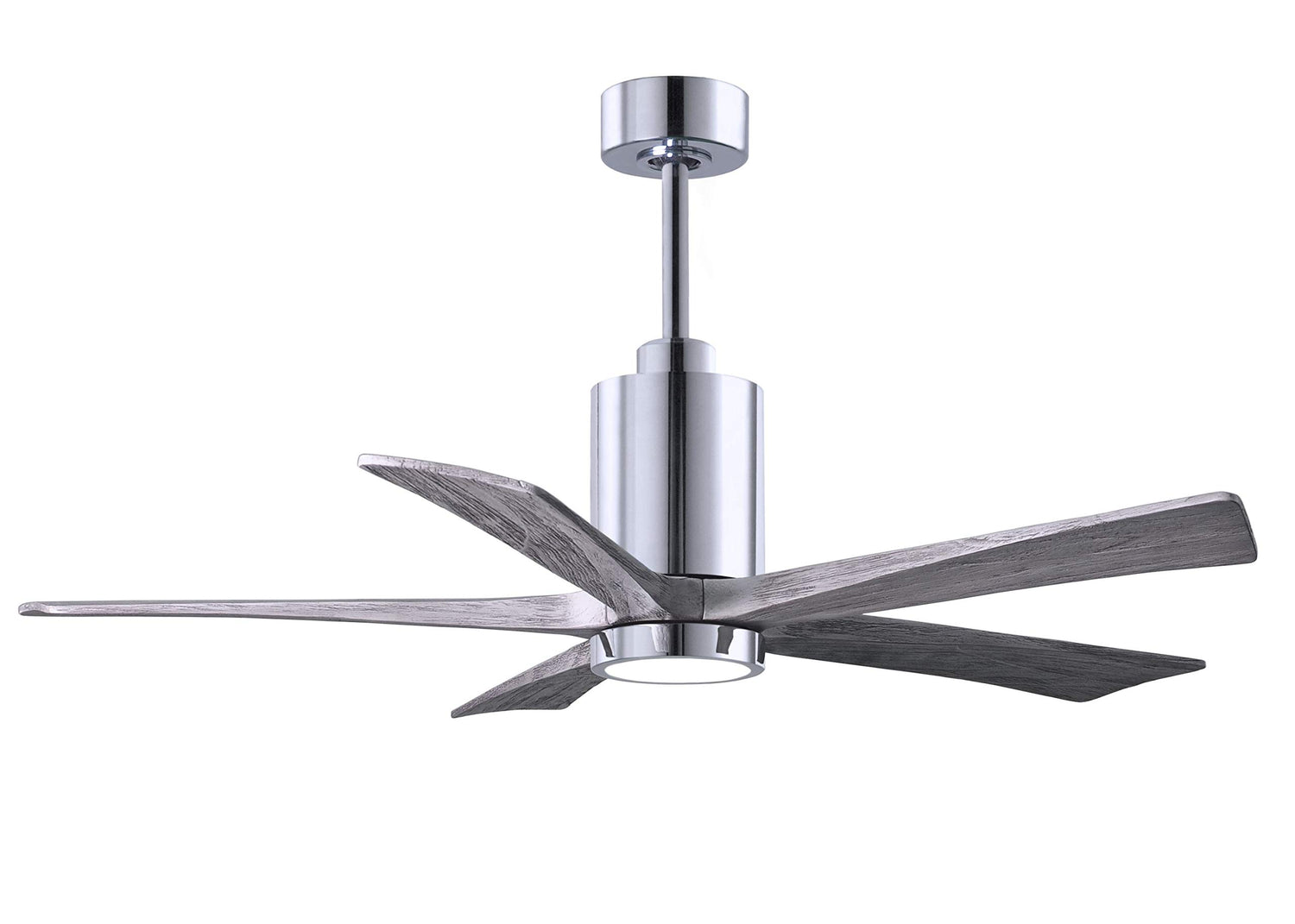 Matthews Fan PA5-CR-BW-52 Patricia-5 five-blade ceiling fan in Polished Chrome finish with 52” solid barn wood tone blades and dimmable LED light kit